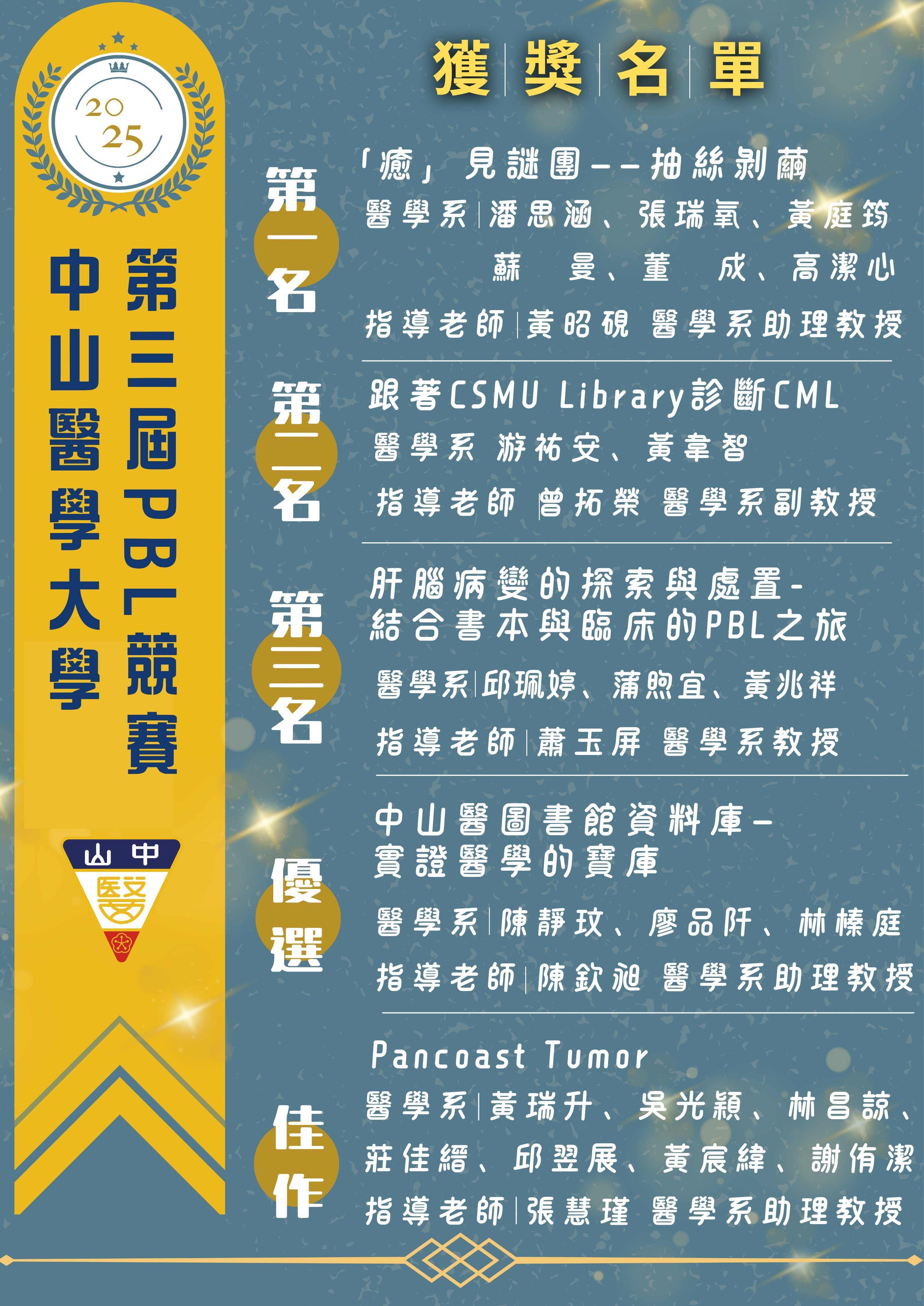 【賀】醫學系學生榮獲114年中山醫學大學第三屆PBL競賽佳績