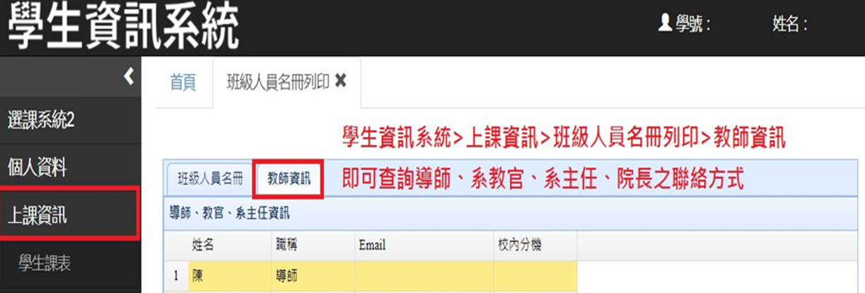 學生查詢導師、系教官、系主任、院長之聯絡方式: